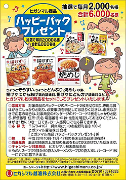 ヒガシマル醤油株式会社(本社:兵庫県たつの市、社長:淺井昌信)は、昨年に引き続き、人気の「うどんスープ」、「揚げずにからあげ鶏肉調味料」をはじめ粉末商品全品を対象に、ヒガシマルの粉末商品の詰め合わせが合計6,000名様に当たる「ヒガシマル商品 ハッピーパックプレゼント」を、2010年10月より12月末日まで実施いたします。