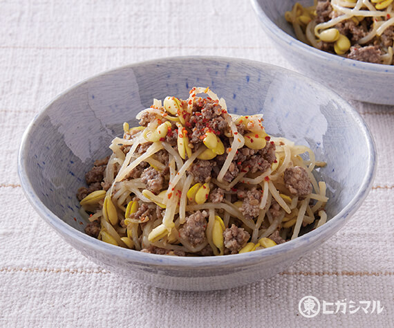 ひき肉のうま味を大豆もやしになじませるため、ふたをして火を通すのがポイント。ごはんにのせてビビンバにするのもおすすめ!