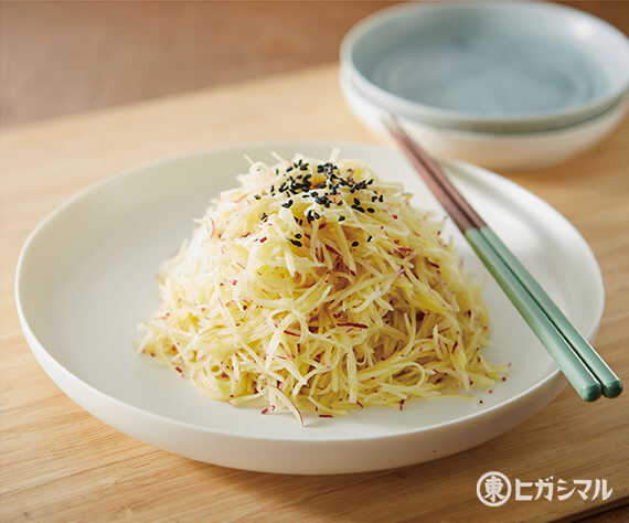 - さつまいもは皮つきのままスライサーで薄切りにし、さらに細かくせん切りにする。