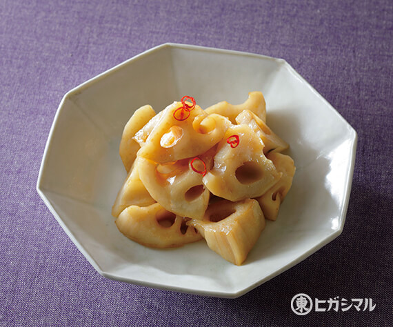 - フライパンにごま油を中火で熱し、れんこんを並べ入れ、時々上下を返しながら焼く。全体に少し透明感が出てきたら甘酢を回し入れ、ほとんど汁けがなくなるまで、からめながら煮詰める。